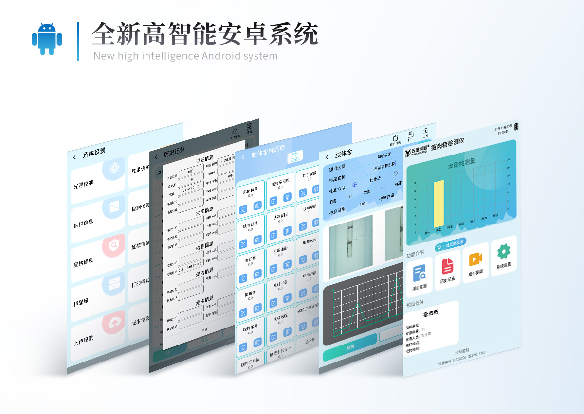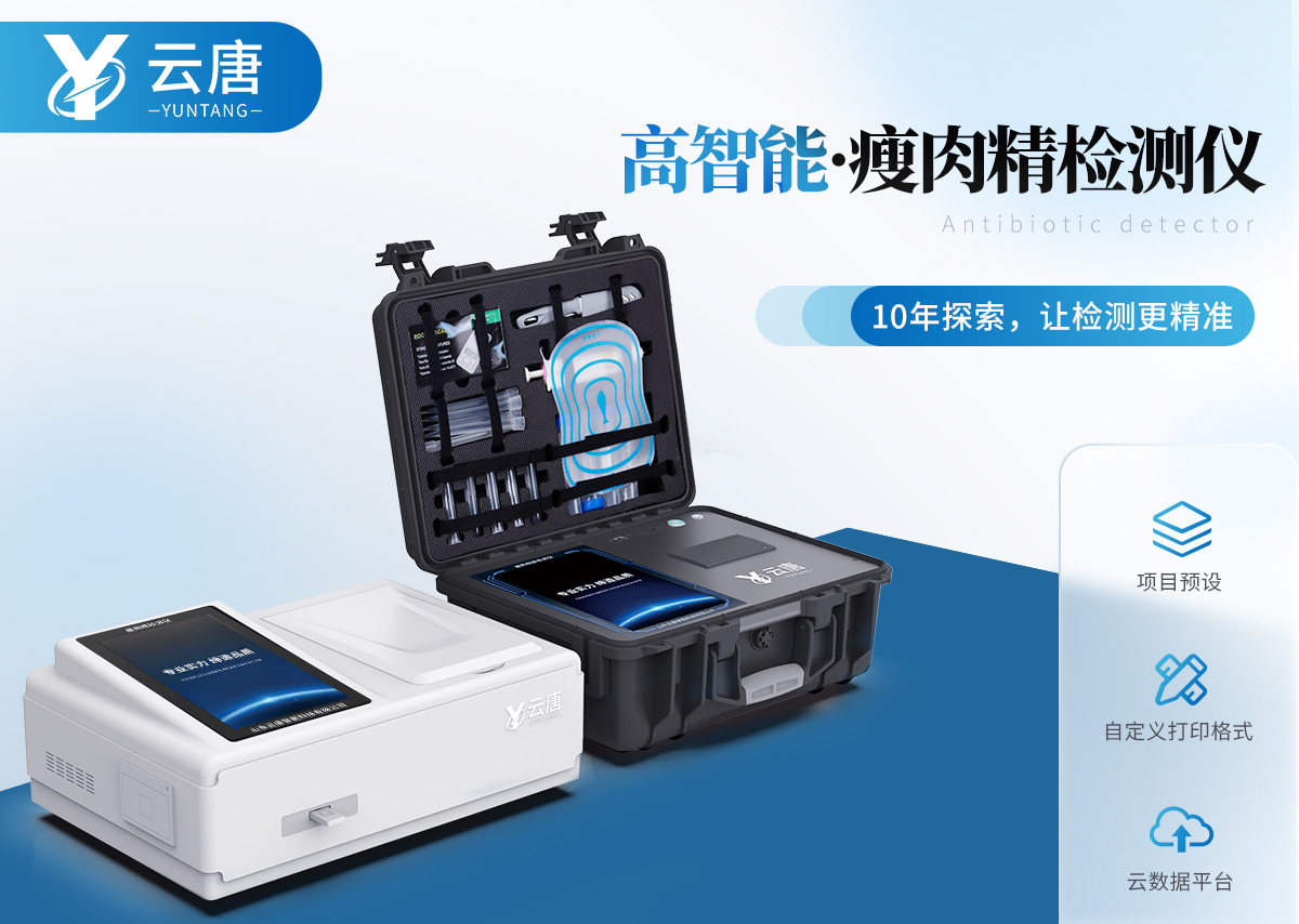 山東云唐智能科技有限公司生產的瘦肉精檢測儀可現場快速檢測鹽酸克倫特羅、萊克多巴胺、沙丁胺醇、己烯雌酚、喹乙醇等。儀器預留其他項目檢測程序和端口,根據日后需求可進行遠程設備升級。日后可升級為檢測抗生素、獸藥殘留、動物疫病等檢測項目的綜合類型儀器。