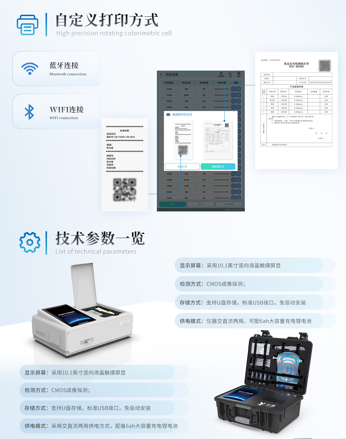 9、A4紙版本報告打印功能(可選配):設備擁有兩種結果展示方式,可以自動生成A4打印模板和小票打印模板兩種樣式,可通過WiFi及網線等方式鏈接外置打印機可進行打印